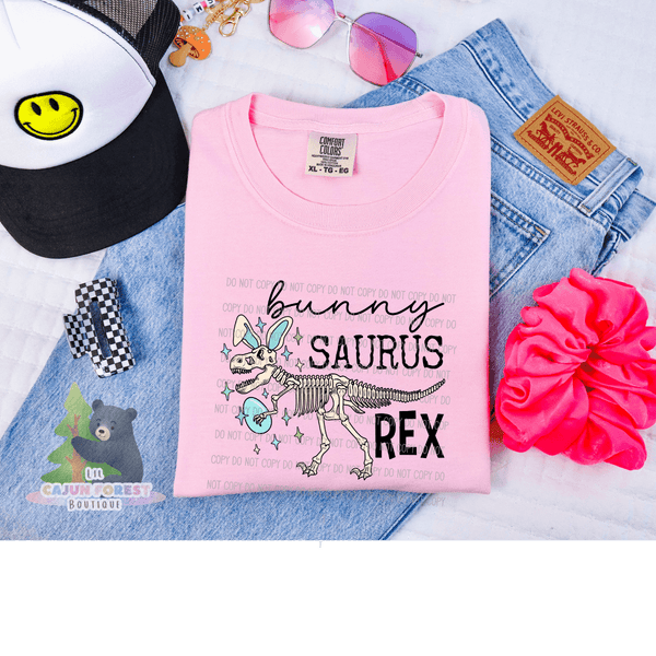 Hop into style with our Bunnysaurus Rex graphic t-shirt! Featuring a quirky and fun graphic of a dinosaur skeleton bunny, this t-shirt is sure to bring a smile to anyone's face. Show off your playful personality and love for both bunnies and dinosaurs with this unique shirt. Rawr!